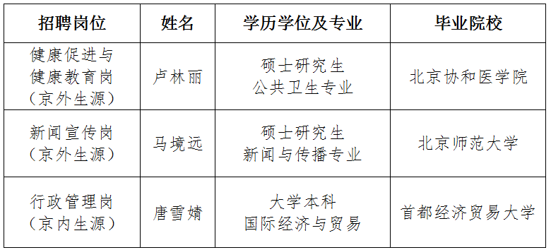 根据事业单位公开招聘工作有关规定,经网上公开招聘、资格审查、笔试、面试、考察、体检、心理测试等程序,拟聘用卢林丽、马境远、唐雪婧3名同志到我中心工作,现将有关情况予以公示。