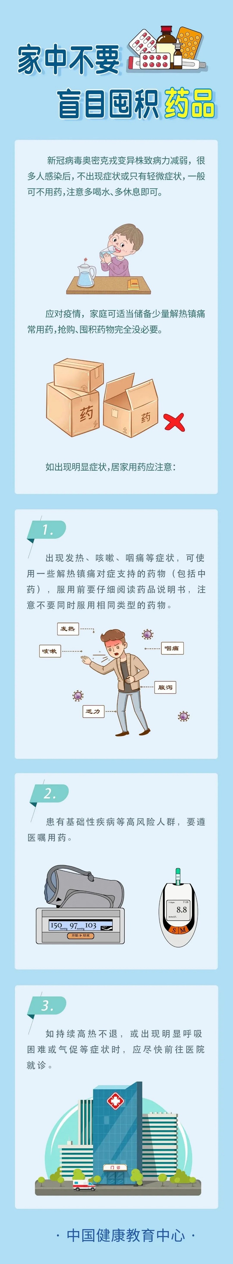 为进一步做好新冠肺炎疫情防控的知识普及和宣传,中国健康教育中心制作了新冠疫情防控健康教育系列长图。今天发布4张,包括新冠病毒奥密克戎变异株致病力减弱、老年人接种新冠疫苗获益大、家中不用盲目囤积药品和个人防护不放松等主题内容。
