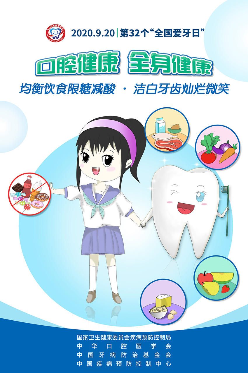 2020年“全国爱牙日”的宣传主题是“口腔健康 全身健康”,副主题是“均衡饮食限糖减酸 洁白牙齿灿烂微笑”,以口腔健康与全身健康的关系为切入点,加大口腔健康科普宣传力度,提高群众口腔健康素养水平,营造有利于口腔健康的良好社会氛围。